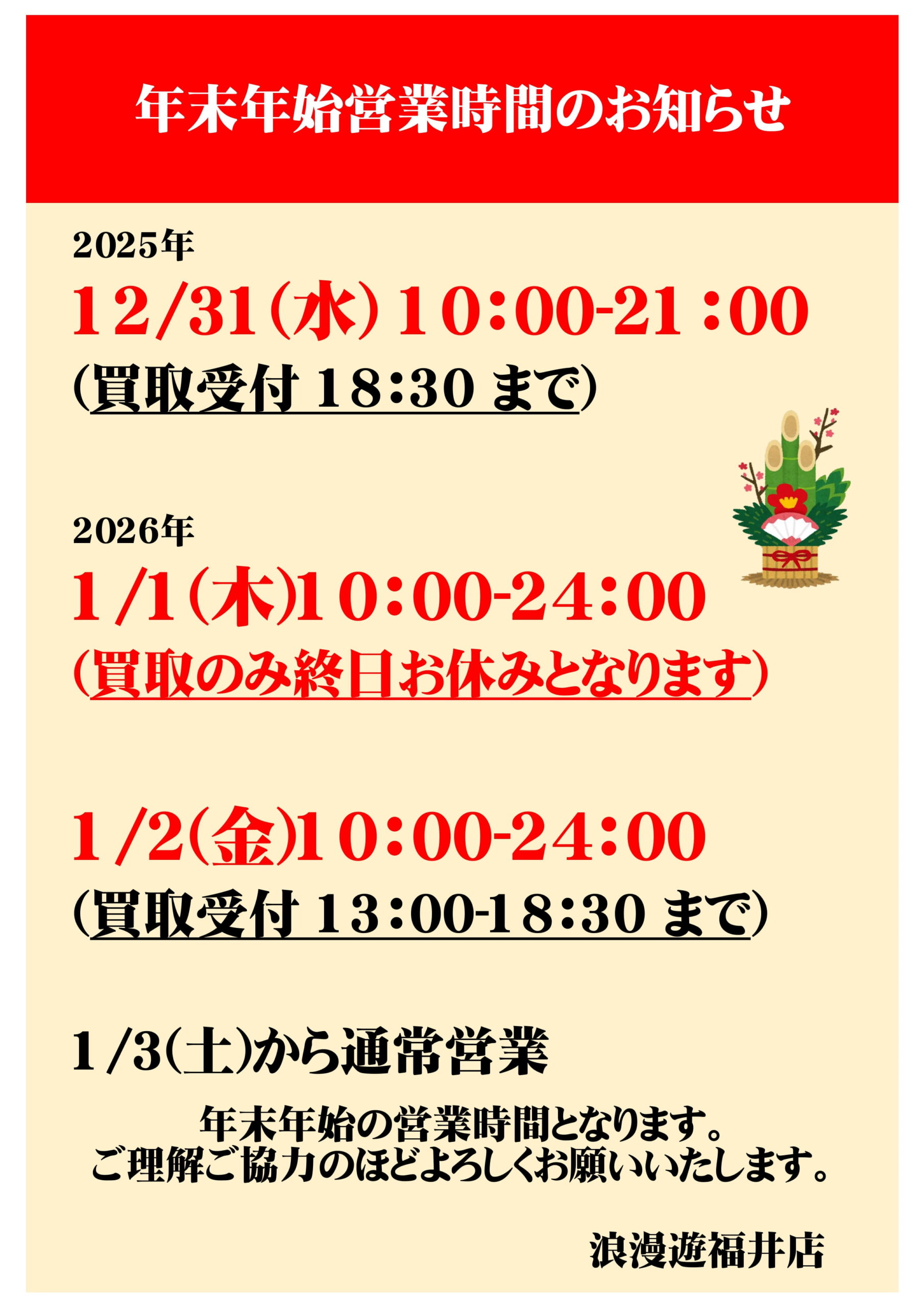 年末年始営業時間のお知らせ!